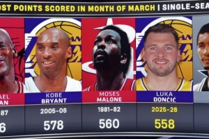 今年三月东契奇总得分558分历史上三月份第3,乔丹科比前2,摩西·马龙第3,乔治·格文第5