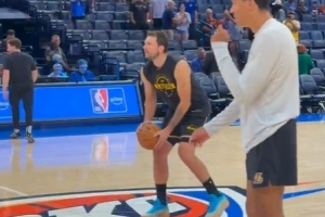 GIF-东契奇赛前踩着Logo 两记中场超远三分连续命中