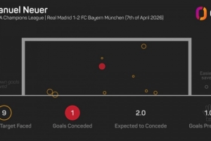 拜仁门将诺伊尔本场比赛做出9次扑救,他是有相关统计以来,首位在客战皇马的欧冠淘汰赛中做出9次扑救的门将。